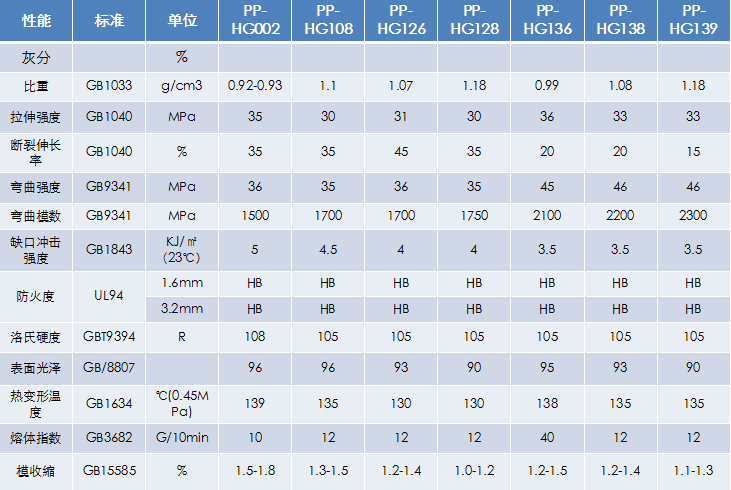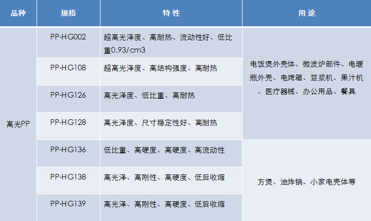 牌號:PP-HG002、PP-HG108、PP-HG126、PP-HG128應(yīng)用:家用電器外殼、部件醫(yī)療器械、辦公用品、餐具用品等特點:高光澤度、高耐熱、流動性好、尺寸穩(wěn)定、易清潔、低比重
